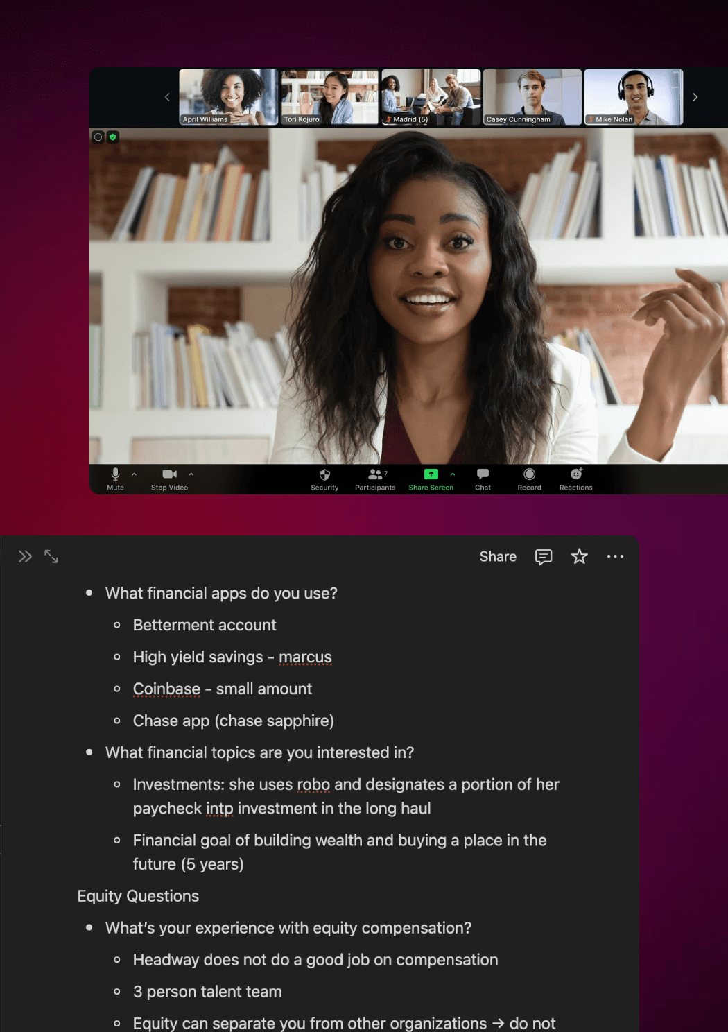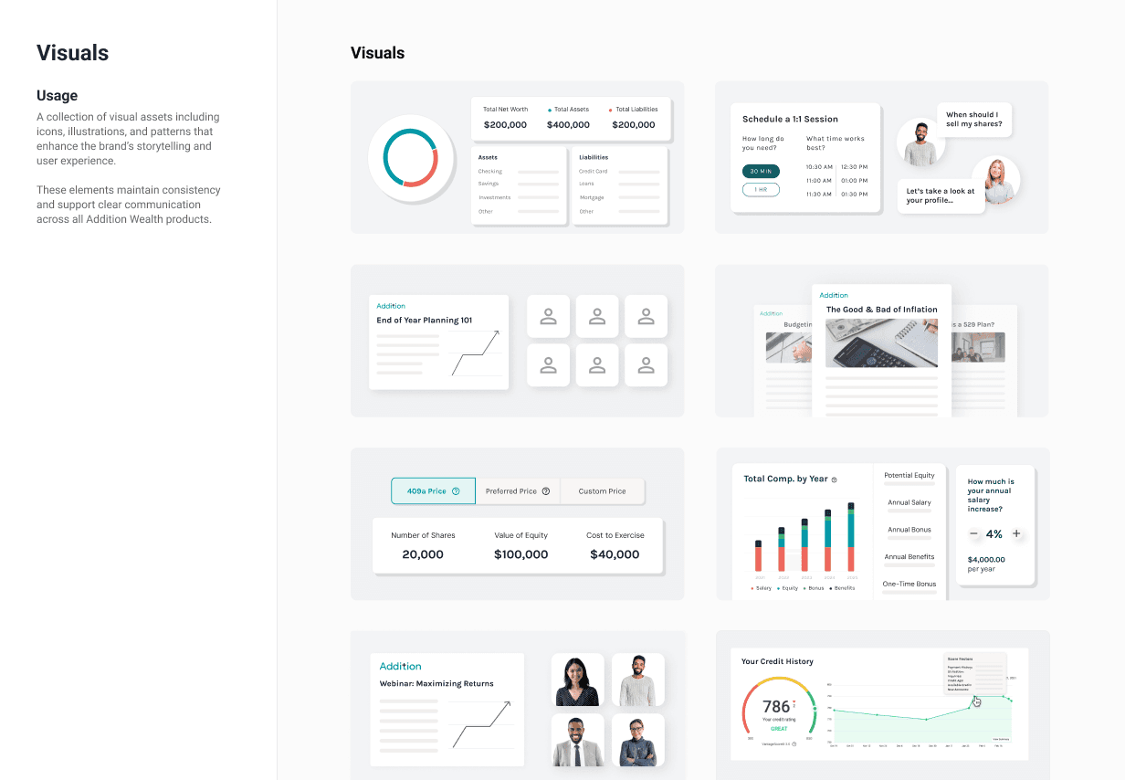I had no domain knowledge on equity going in. So I treated that as an advantage. I researched until I had a working knowledge base, then went directly to Addition's financial advisors and users to test what I'd learned. The gap between what I assumed and what users actually needed became the design brief.