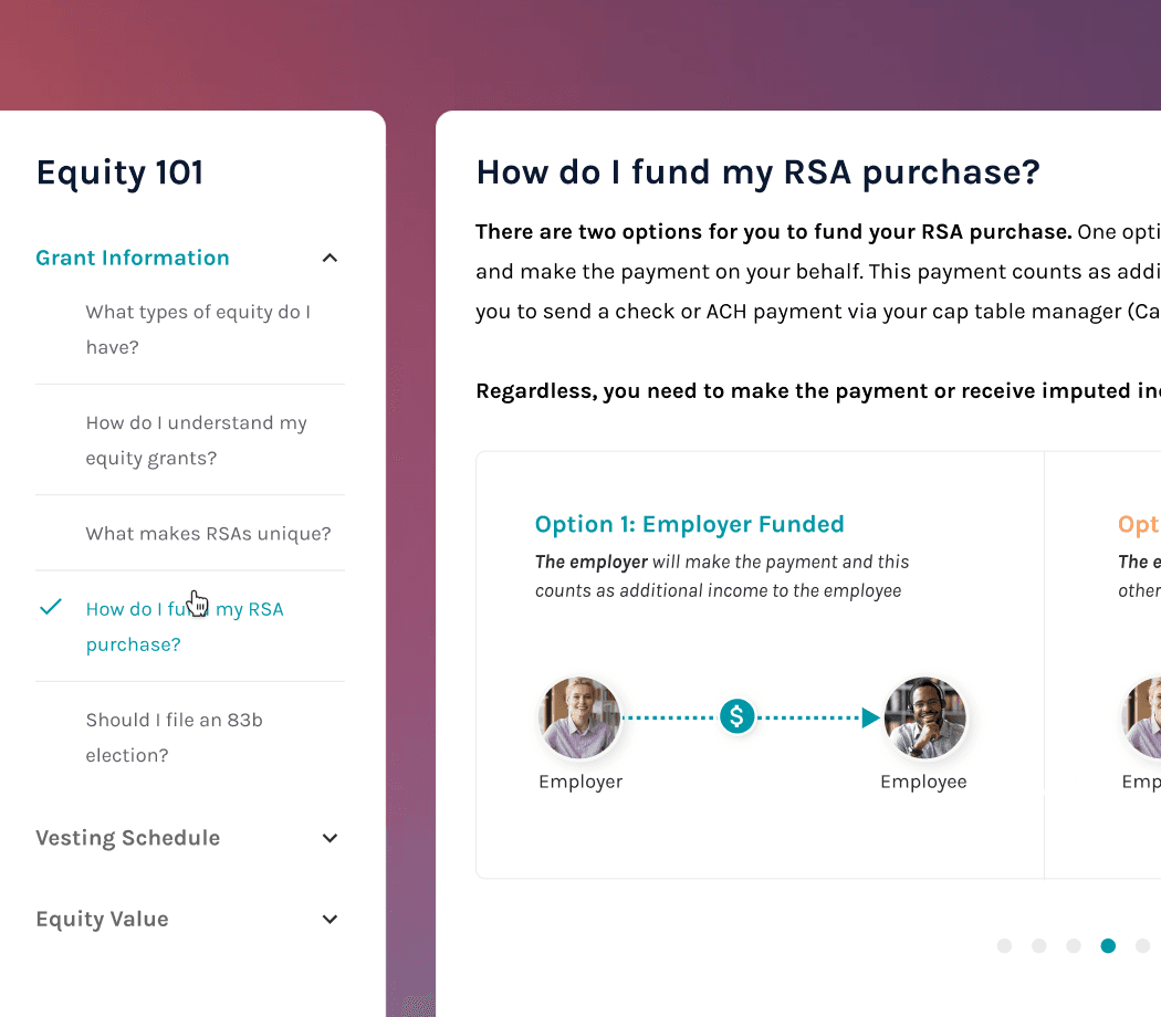 So I designed an interactive course format across 15+ financial topics. The personalization was the differentiator – once a user linked their accounts, courses stopped using hypothetical examples and started using their actual numbers. In the equity 101 course, the 'how to calculate your equity value' equation pulled your real strike price and share count. Abstract concept became personal reality.