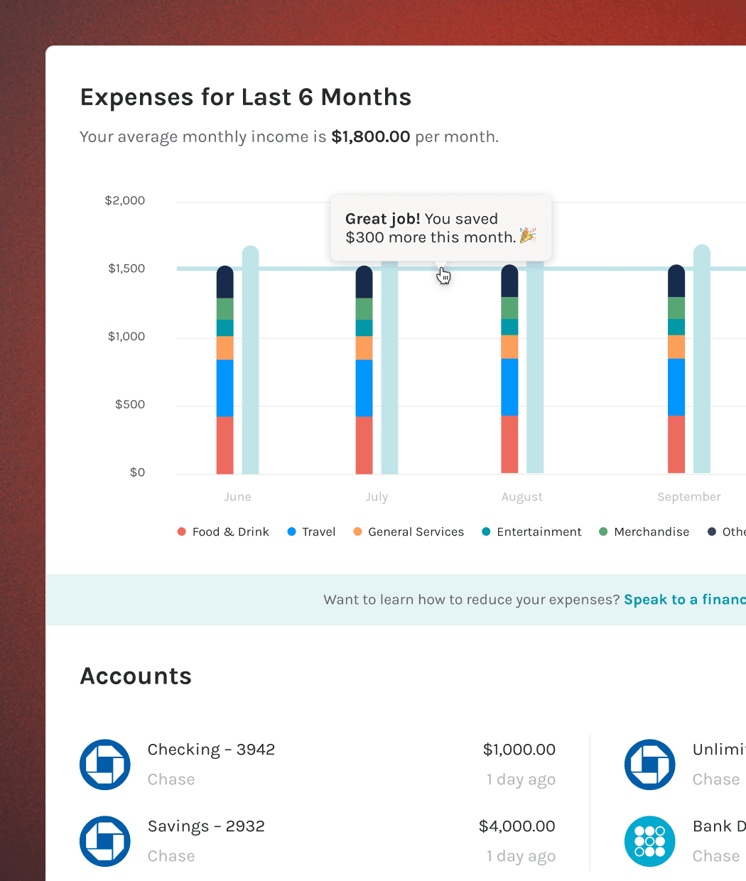 The insight that drove this feature came from a customer interview that stuck with me: a user didn't know how much money was in their checking account. They weren't irresponsible, they were just caught up by real life. Multiple accounts across multiple institutions, no single place to see the full picture. That was the real problem – not that people lacked financial knowledge, but that they lacked financial visibility.